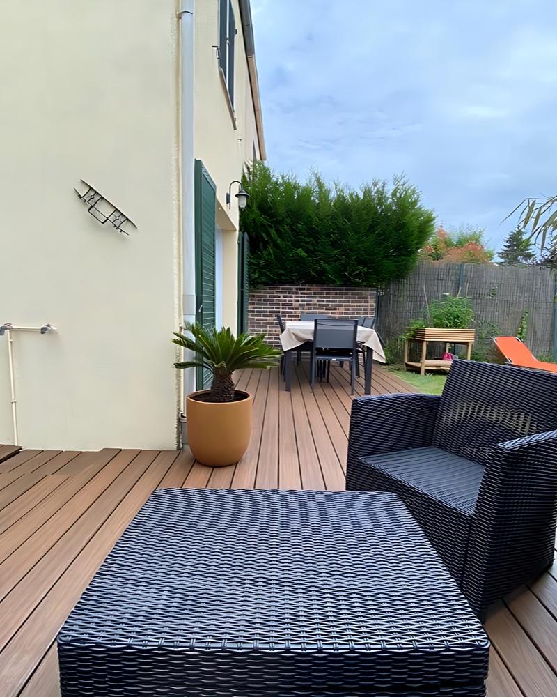 Pour cette rénovation, nous avons conçu une terrasse alliant esthétisme et robustesse. Nous avons posé des lames en composite, offrant à la fois élégance et longévité, soutenues par une structure en lambourdes également en composite pour garantir une grande durabilité. Des cales en caoutchouc ont été utilisées pour une installation optimale et une stabilité renforcée. Cette terrasse design, nécessite peu d’entretien, idéale pour profiter pleinement de l’extérieur.