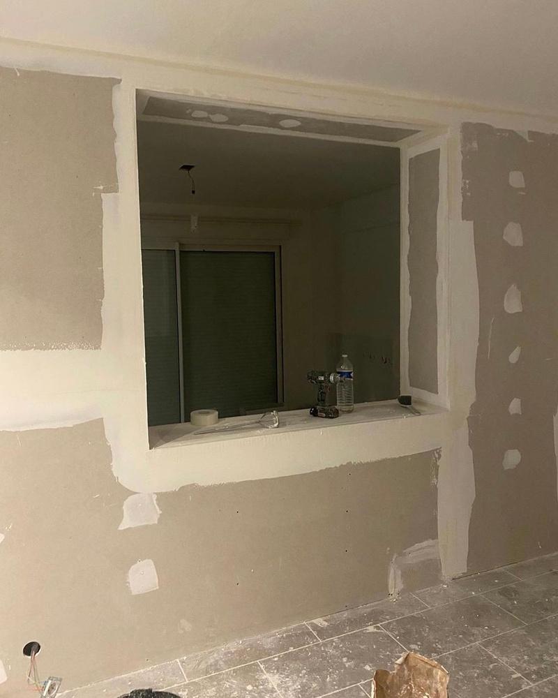 Pour ce projet, notre client souhaitait maximiser la luminosité de son séjour. Nous avons donc créé une ouverture en structure métallique et BA13, de forme carrée, pour offrir une belle perspective et un apport de lumière naturel.