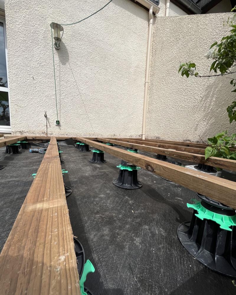 Pour cette rénovation de terrasse, nous avons pris soin de repenser chaque détail avec précision. Après avoir déposé l’ancienne terrasse en bois, nous avons remis à niveau le sol pour installer des plots parfaitement ajustés. Une toile de paillage et des lambourdes ont été mises en place pour garantir une stabilité durable. Les lames de bois ont été découpées et créées sur mesure, avec des cornières et des plinthes de finition pour un rendu impeccable. Enfin, une trappe de visite sur-mesure a été installée pour offrir un accès pratique et discret.