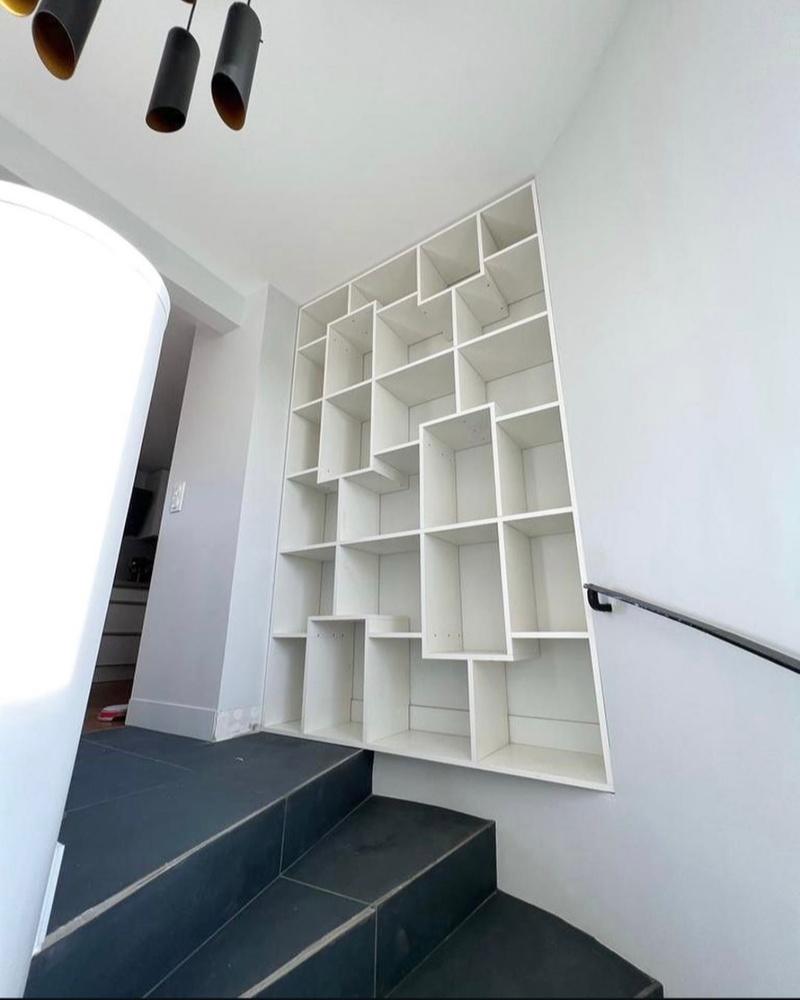 Nous sommes ravis de vous présenter cette magnifique bibliothèque, intégrée juste après les escaliers au premier étage, et conçue spécialement pour notre cliente.