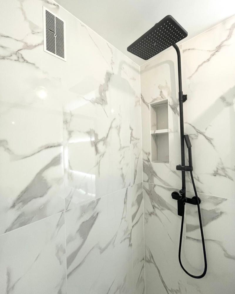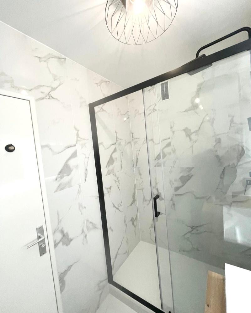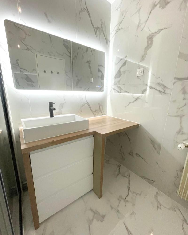 Afin d’assurer une installation durable et conforme aux normes, le réseau de plomberie a été entièrement refait et l’électricité modifiée. Le choix d’un carrelage effet marbre au sol et aux murs apporte une touche raffinée, sublimée par un miroir LED qui renforce la luminosité de la pièce.