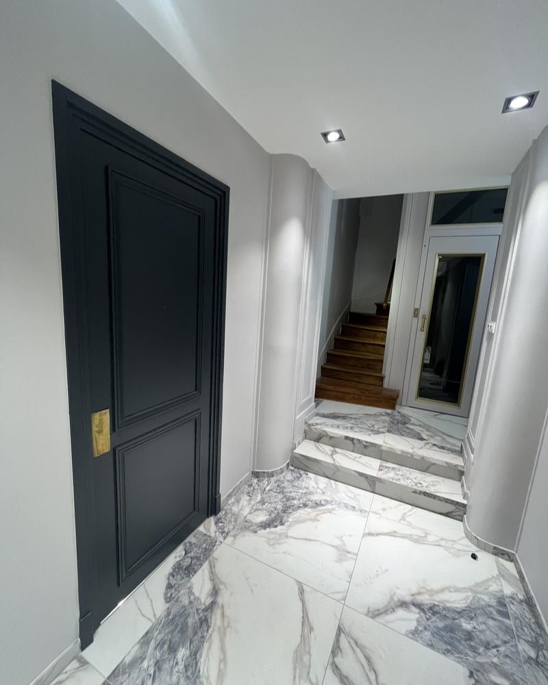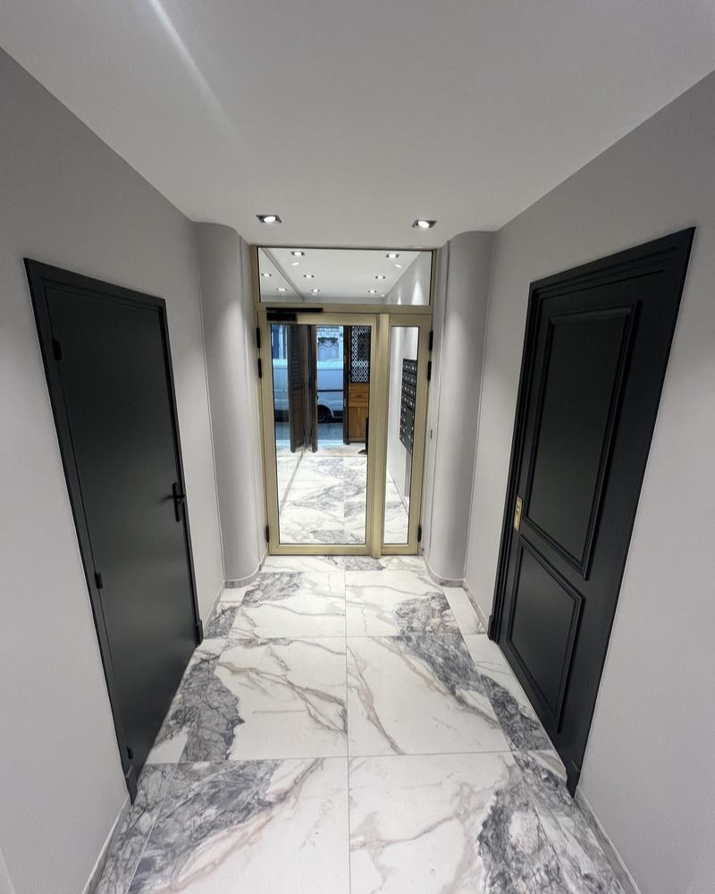- Revêtements et sols : Dépose des anciens revêtements et pose au sol de nez de marches sur mesure et d’un carrelage effet marbre 60×60, apportant élégance et modernité aux sols des parties communes.