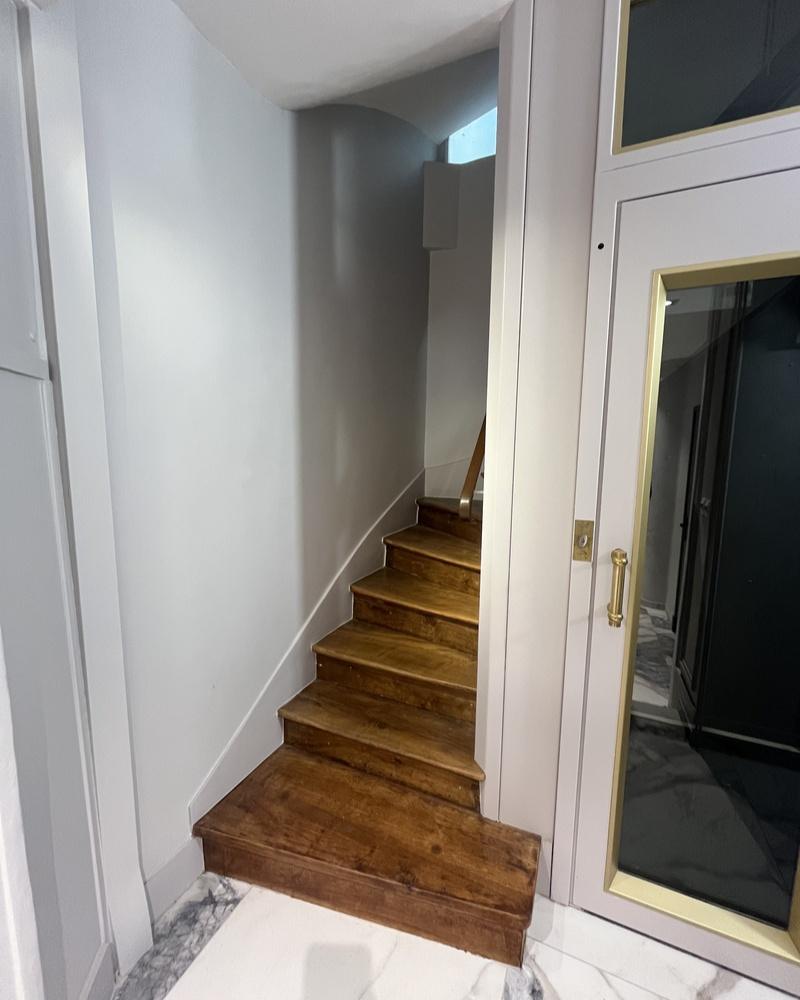 - Aménagements spécifiques : rénovation de la cage d’escaliers, vitrification des marches et création de coffrages pour un résultat soigné et contemporain.