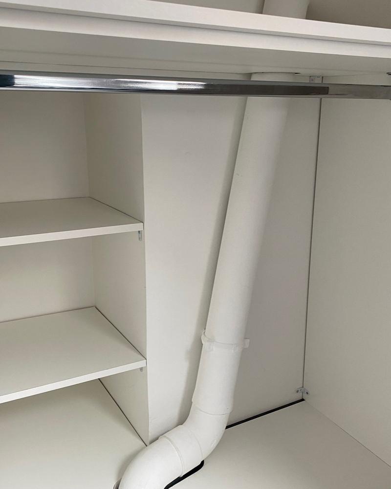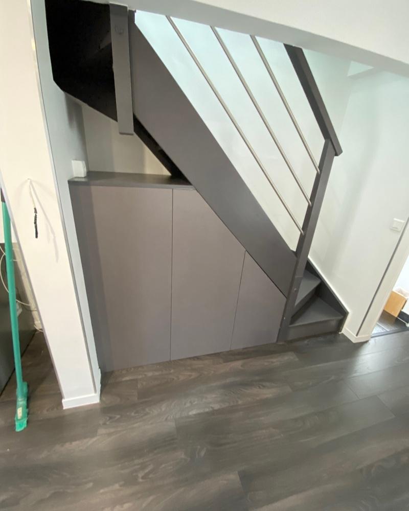 Pour notre client, nous avons créé une penderie sur mesure sous l’escalier, composée de 3 caissons avec portes PUSH pour un accès pratique et élégant