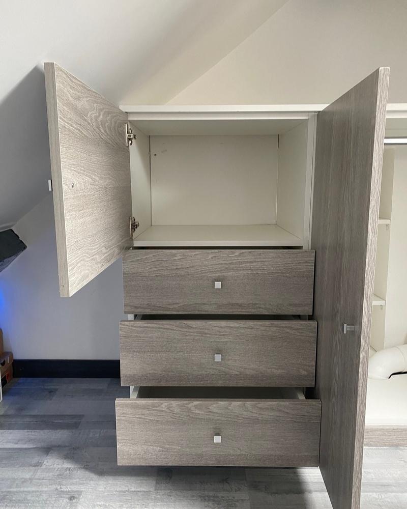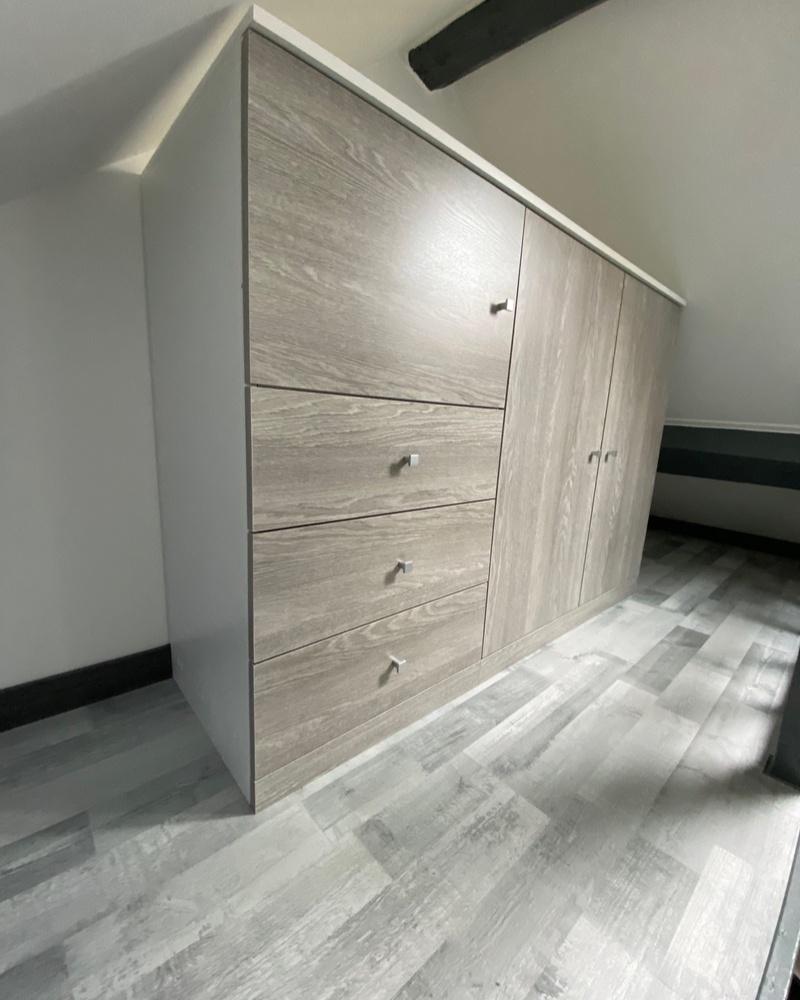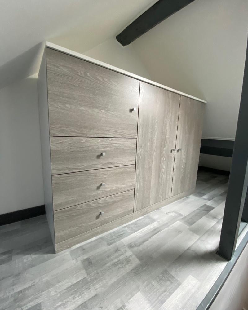 Nous avons également conçu une armoire sur mesure dans les combles, optimisant l’espace avec des tiroirs, des carrés de rangement et un dressing intégré