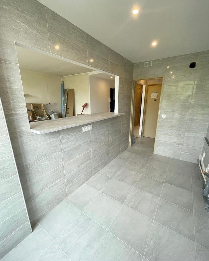 Les travaux ont débuté par une démolition complète de la cuisine et des WC afin de repartir sur une base totalement neuve. Nous avons créé une ouverture sur mesure, intégrant un plan de travail, permettant un accès direct au séjour pour une meilleure fluidité entre les espaces. L’ancienne porte de cuisine a été retirée et condamnée, tandis qu’une cloison métallique en BA13 a été installée pour isoler la pièce. Le réseau de plomberie a été entièrement revu pour la cuisine et les WC.