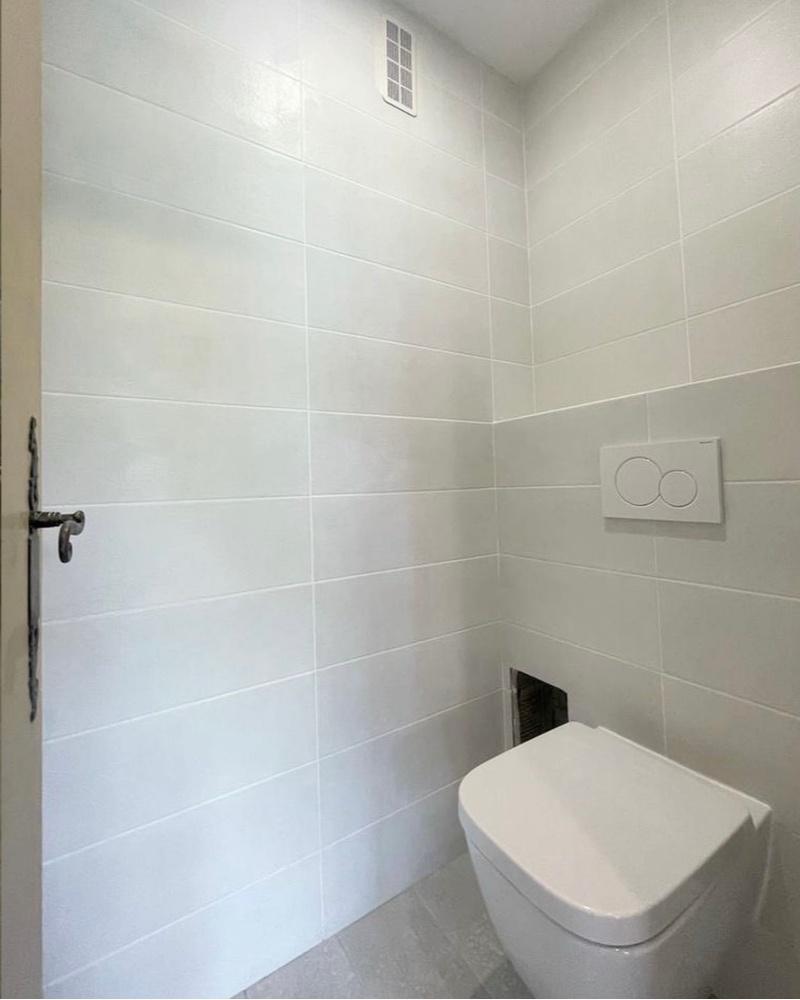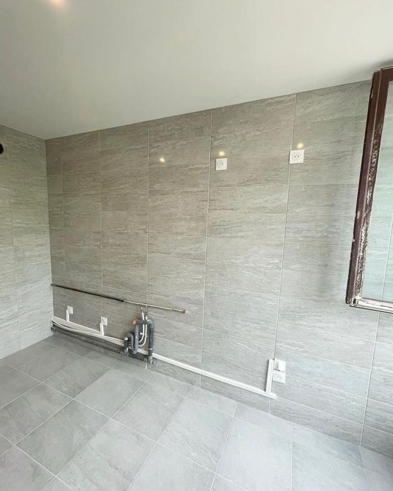 Côté finitions, un carrelage mural en 20 x 60 a été posé pour un style épuré et moderne, tandis qu’un carrelage au sol de 40 x 40 a apporté un look élégant. Pour certaines zones, un carrelage plus petit de 20 x 30 a été utilisé pour créer une atmosphère plus intime. Enfin, un bâti support pour WC suspendu a été installé avec un coffrage en BA13, ainsi qu’un WC suspendu Geberit pour une touche de confort et de modernité.