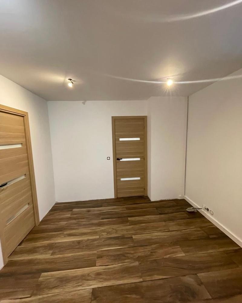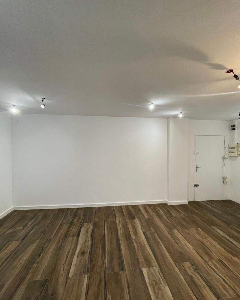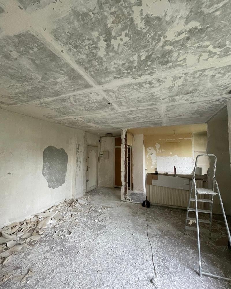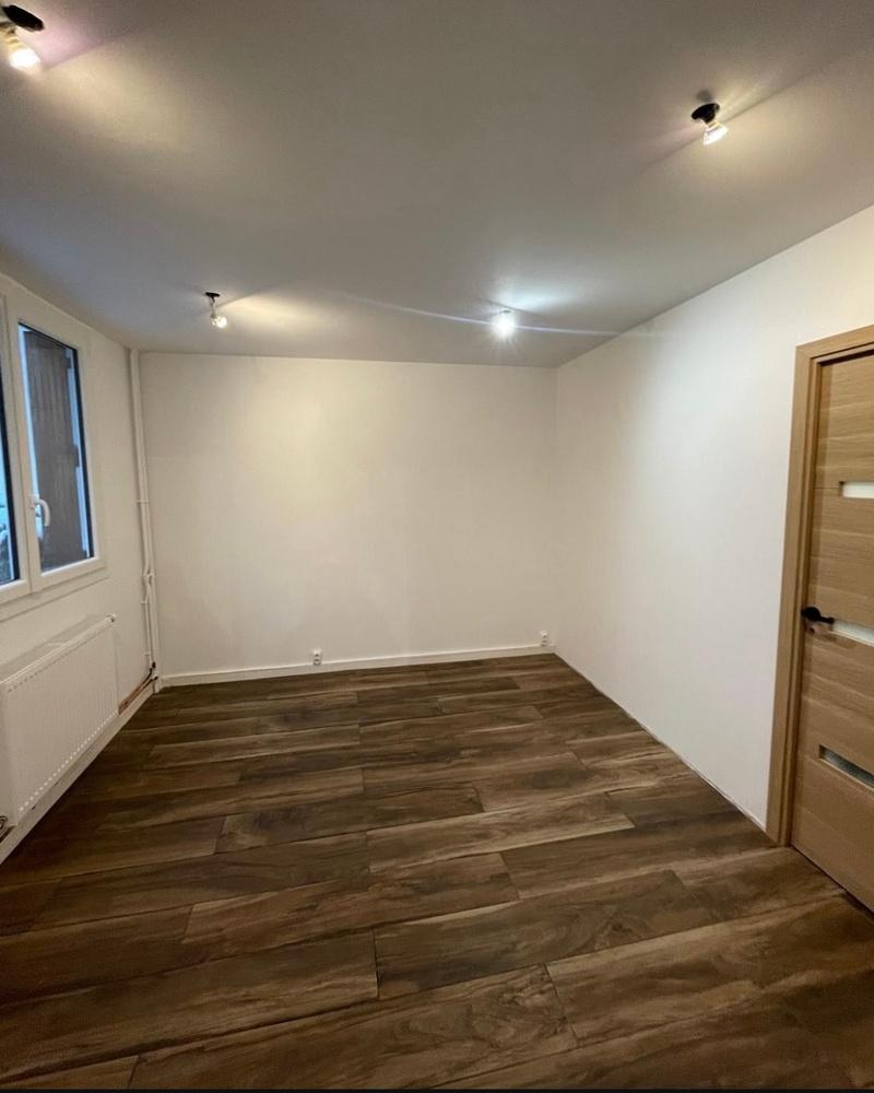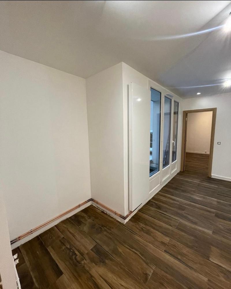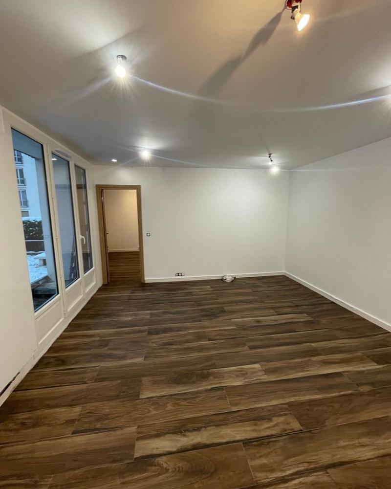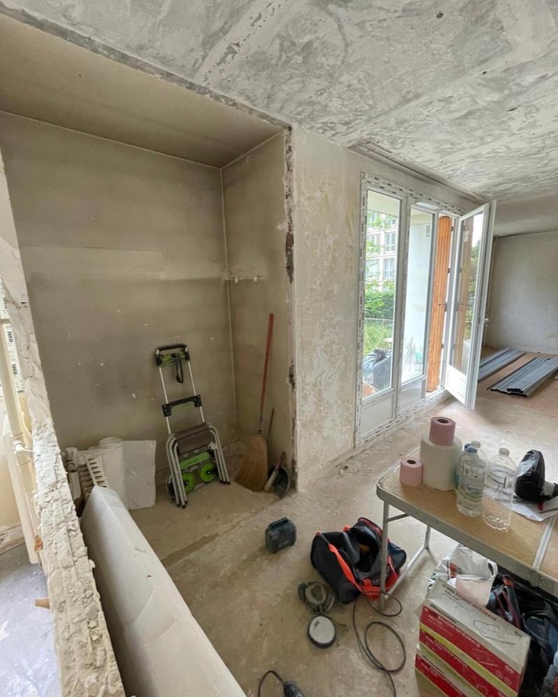 Les travaux réalisés incluent la création de faux plafonds suspendus et autoportants en BA13 pour intégrer un nouveau réseau électrique et repenser l’éclairage. Les plafonds ont été repeints en blanc mat, tandis que les murs des pièces sèches ont été recouverts d’une finition velours et ceux des pièces humides d’une peinture satinée. Côté revêtements, un carrelage effet parquet noyer a été posé dans l’entrée, le séjour et la chambre, tandis qu’un carrelage effet pierre 60×60 habille désormais la cuisine. Le réseau de chauffage a été modifié avec l’installation de nouveaux radiateurs, et l’espace cuisine a bénéficié d’une rénovation complète de sa plomberie.