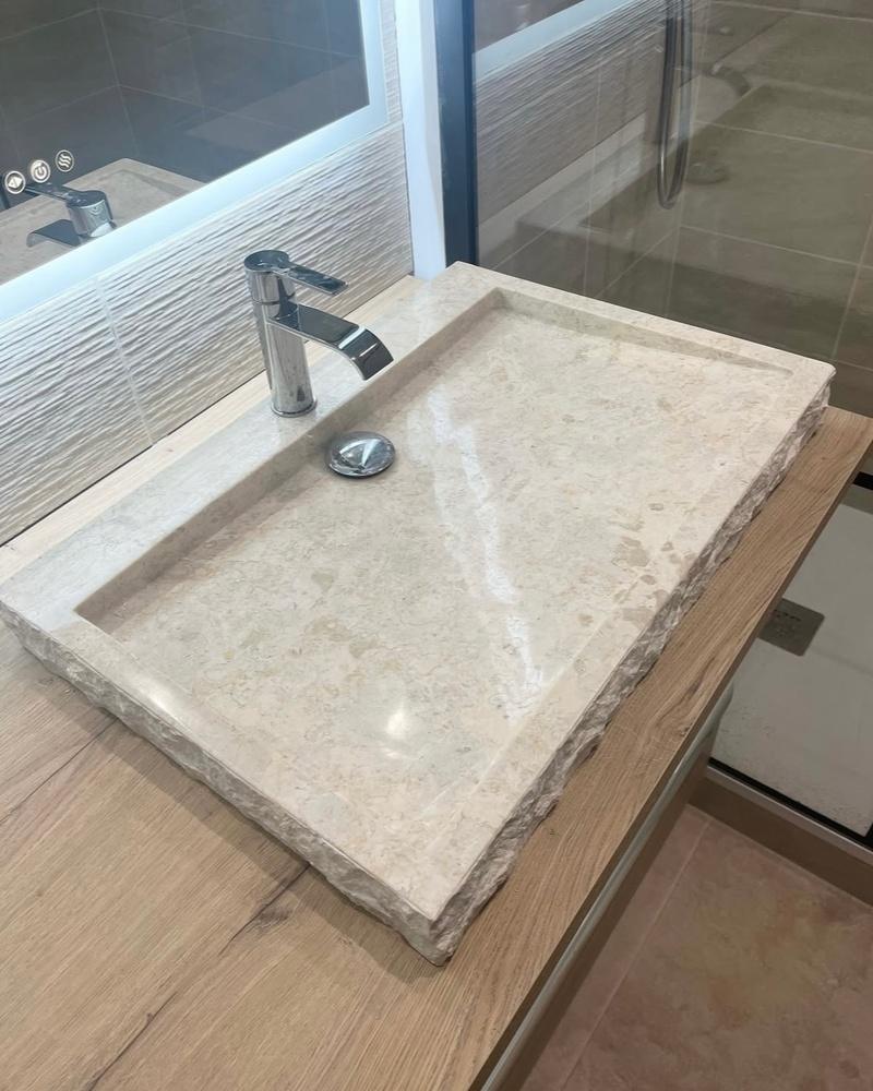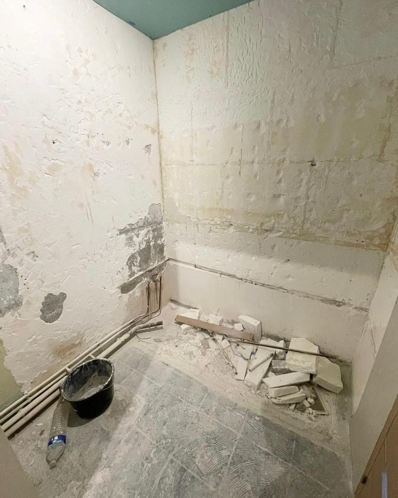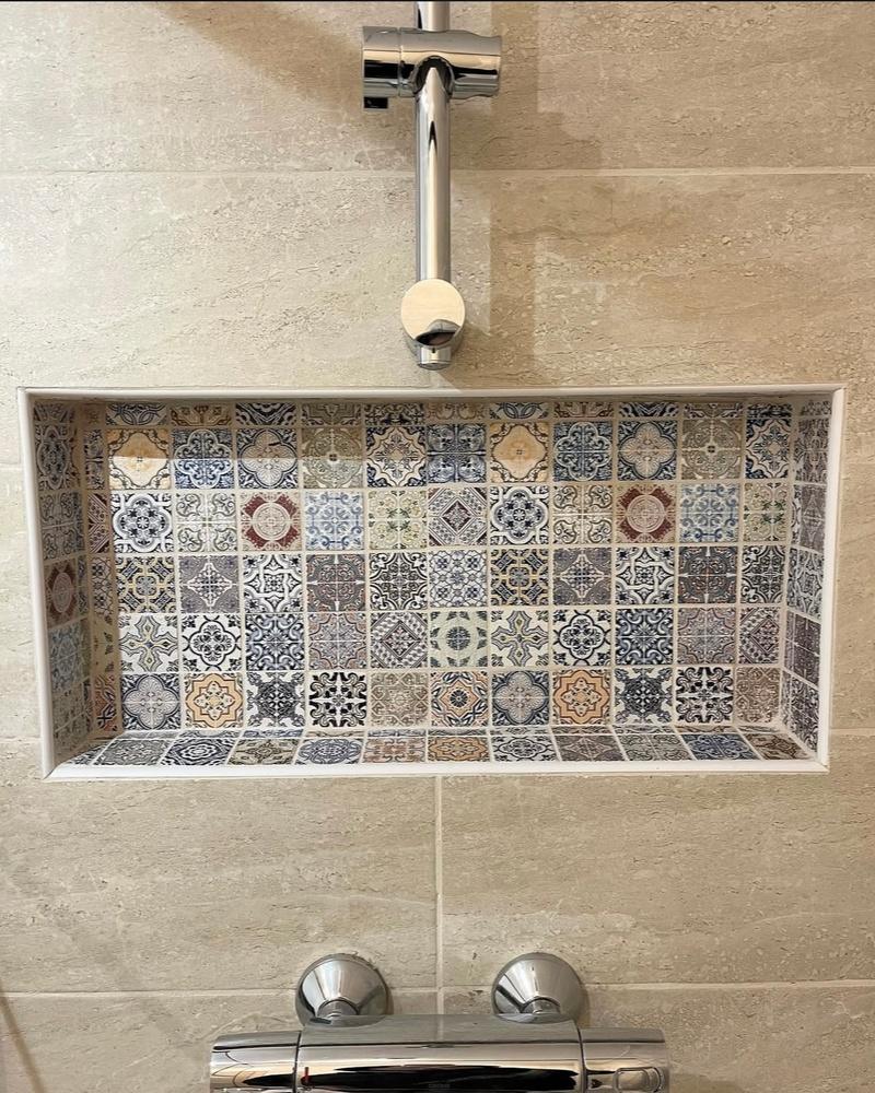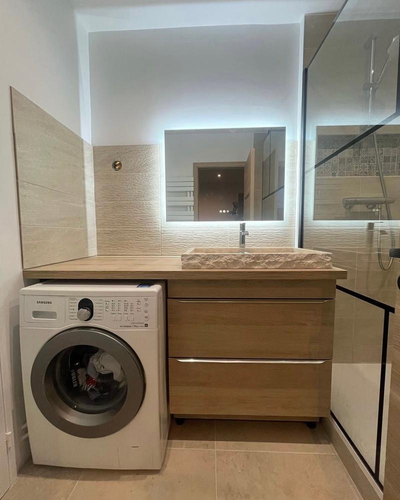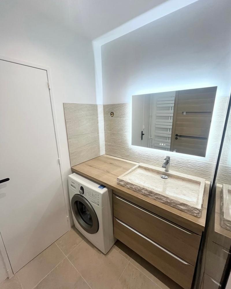 Dans la salle de bain, une transformation complète a été réalisée : faux plafond, doublage des murs en BA13, refonte totale de la plomberie et réagencement de l’électricité. Une douche élégante a été créée, intégrant une niche sur mesure avec un revêtement mosaïque pour un rangement pratique. Le sol et les murs ont été recouverts d’un carrelage effet pierre, et un sèche-serviette a été installé pour plus de confort.