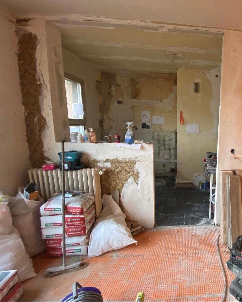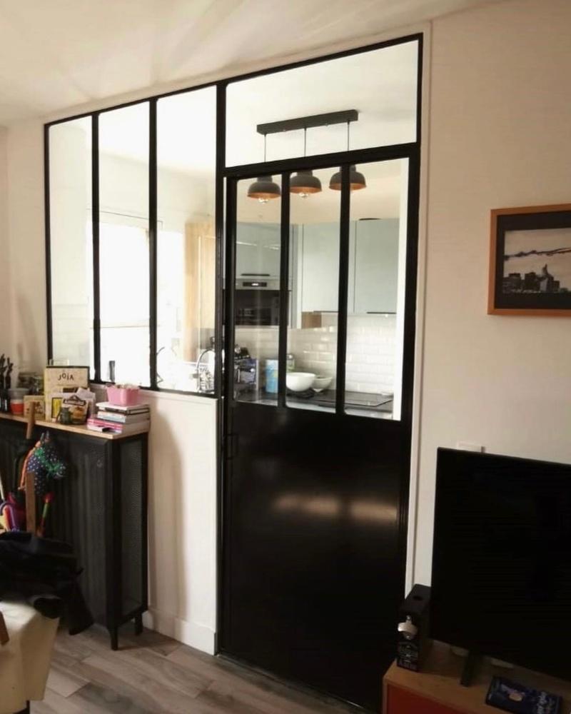 L’ouverture de cette cloison a permis d’installer une verrière sur-mesure, apportant luminosité et modernité à la cuisine et au séjour. Grâce à sa porte industrielle, nous avons créé un nouvel accès fonctionnel et esthétique entre ces deux espaces, tout en optimisant la circulation de la lumière naturelle.