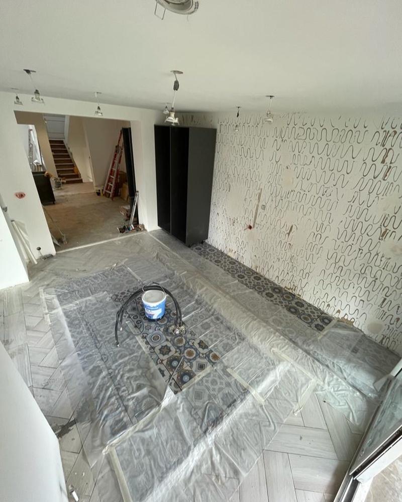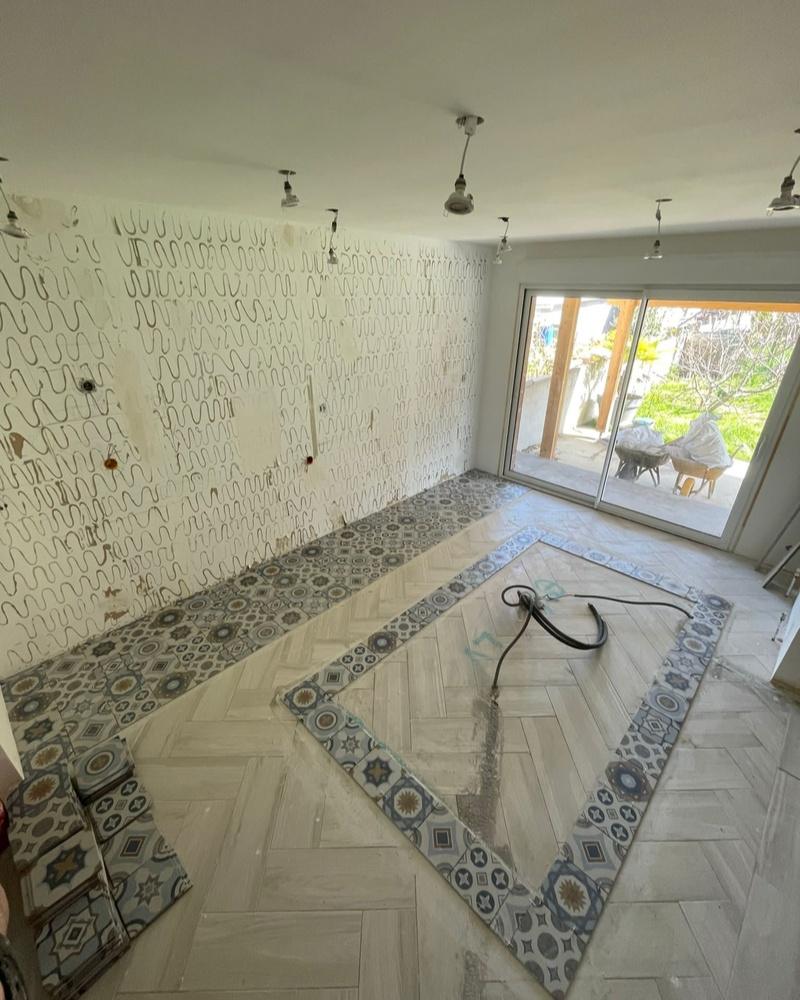 Découvrez cette rénovation complète d’une cuisine, parfaitement intégrée au séjour pour créer un espace ouvert et convivial. Le projet a débuté par la pose de carrelage élégant et de parquet bois massif en chevrons sur mesure, apportant chaleur et style à l’ensemble. La rénovation a également inclus l’installation de plaques BA13, suivie d’une finition peinture soignée pour un rendu impeccable. Une cuisine équipée a été conçue avec soin, incluant un îlot central personnalisé, offrant ainsi un espace à la fois pratique et agréable pour partager des moments conviviaux.